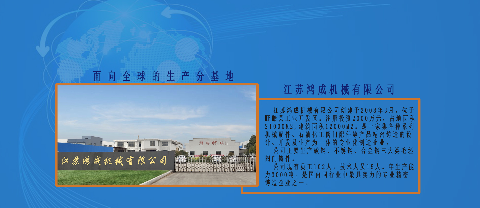鄞州鴻成機械有限公司通過全體員工的團結奮進、頑強拼搏,發展迅速,公司占地面積7200平方米,已有員工180余人,擁有各類專業技術人員。專業生產各類普碳鋼、合金鋼、不銹鋼、精密鑄造產品廣泛用于冶金、礦山、石油、化工、鐵路、船舶、車輛等機械制造行業年產精鑄件2500噸以上。
